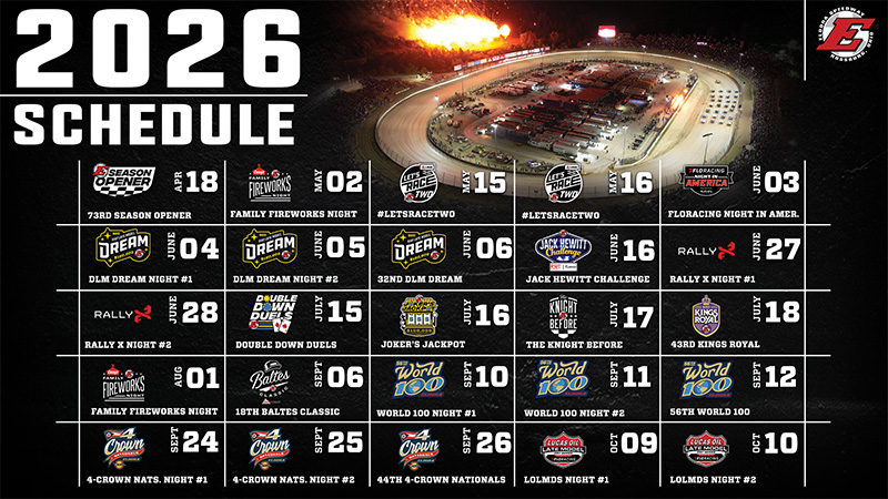 2026: SCHEDULE & TICKET UPDATES Updated 12/18/25 LOGIN TO RENEW The renewal window for tickets, camping, and suites to ALL 2026 EVENTS is now open! Deadline to renew is January 30th at 11:59 PM. Tickets can be renewed via the following: Online at eldoraspeedway.com/tickets (login in to your ticket account to see what is held for you) Over the phone at 937-338-3815 beginning January 5th In person at the Eldora box office beginning January 5th NEW: Apple Pay and Google Pay now accepted (along with all major credit cards) Add & Exchange Days will be February 9-14. Public sale begins February 20. ELDORA SPEEDWAY UNVEILS 2026 SCHEDULE: SAME ICONIC EVENTS. SAME FAN-FRIENDLY PRICES. ROSSBURG, OH — (December 15) Eldora Speedway today announced its powerhouse 2026 schedule, delivering everything fans love — and more. All the crown jewel events return, from the Dirt Late Model Dream and World 100 to the Kings Royal, Let’s Race Two and 4-Crown Nationals, anchoring another year of can’t-miss action on the high banks. In a move that underscores Eldora’s commitment to its fans, all ticket prices remain unchanged for 2026. At the same time, competitors will battle for higher purses across the marquee events with details to come, raising the stakes and the excitement. “Keeping the fan experience front and center while continuing to elevate the competition is what Eldora is all about,” said General Manager Levi Jones. “2026 is shaping up to be one of our most electric seasons yet.” The full event schedule is now available at EldoraSpeedway.com, with ticket renewals open this week and available through January 30th. Public sales will open February 20 at 10:00 AM ET. PRINTABLE SCHEDULE: CLICK HERE