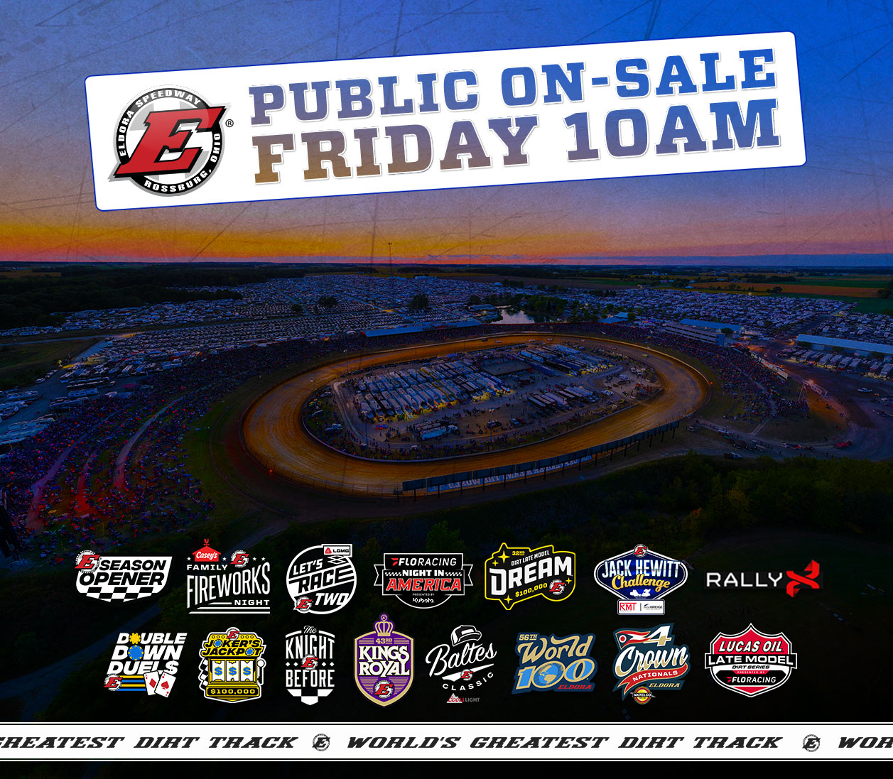 2026: SCHEDULE & TICKET UPDATES Updated 2/19/26 📣2026 Public on-sale: 10AM Friday Feb 20!📣 ———————————— The public on-sale is the busiest ticketing day of the year. Be prepared by reading the notes below… ▶️A virtual waiting room will open at EldoraSpeedway.com/tickets beginning at 9:45. All patrons in the virtual waiting room at 10:00 will then be randomly placed in the queue to purchase tickets. ▶️Anyone who visits the site after 10:00 will placed in the back of the queue, in the order they reached the site. ▶️We have enabled ‘Packages’ inside the ticketing system for 2026. Within multiday events, there will be an option to purchase 2-Day, 3-Day, & 4-Day packages. If the same seat exists across those multiple days, it will be available within those package pages. Please be aware: the same seat is often not available across each event night. Therefore, you will always find better seating selections by purchasing each night individually. There is no difference in pricing when purchasing packages vs individual nights. It’s simply available as an option for those who want the same seat each night. ▶️The south end bleacher breakdown of reserved vs general admission seating has changed. Beginning in 2026, general admission seating includes rows 1 through 5 across all sections (SA-SR). Reserved bleacher seating includes rows 6 and higher across all sections (SA-SR). Additionally, south bleacher sections SD-SI have expanded ten additional rows higher. ▶️Pit passes can now be purchased in advance for any event. This will come in the form of a voucher that can be redeemed for a pit pass arm band on event night. Please note: this advance purchase is for full-priced pit passes only. The upgrade version can only be purchased on event days at the track. ▶️Ticket and camping renewals both set all-time records for the 2026 season. As it pertains to camping, we anticipate selling out of Kings Royal and World 100 camping in less than a week of public on-sale (and perhaps even much faster than that). If you need at-track camping for these events, we highly recommend making your purchase on Friday. BUY TICKETS HERE. ============================================================ ELDORA SPEEDWAY UNVEILS 2026 SCHEDULE: SAME ICONIC EVENTS. SAME FAN-FRIENDLY PRICES. ROSSBURG, OH — (December 15) Eldora Speedway today announced its powerhouse 2026 schedule, delivering everything fans love — and more. All the crown jewel events return, from the Dirt Late Model Dream and World 100 to the Kings Royal, Let’s Race Two and 4-Crown Nationals, anchoring another year of can’t-miss action on the high banks. In a move that underscores Eldora’s commitment to its fans, all ticket prices remain unchanged for 2026. At the same time, competitors will battle for higher purses across the marquee events with details to come, raising the stakes and the excitement. “Keeping the fan experience front and center while continuing to elevate the competition is what Eldora is all about,” said General Manager Levi Jones. “2026 is shaping up to be one of our most electric seasons yet.” The full event schedule is now available at EldoraSpeedway.com, with ticket renewals open this week and available through January 30th. Public sales will open February 20 at 10:00 AM ET. PRINTABLE SCHEDULE: CLICK HERE