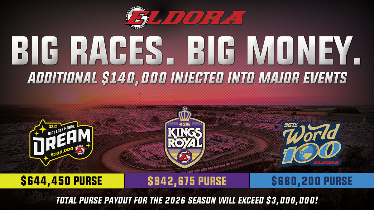 February 27, 2026February 28, 2026 EldoraPR Press Releases, Uncategorized Despite holding the line on 2026 ticket prices, Eldora Speedway is raising the stakes. More than $140,000 has been added to Saturday night purses across the Dirt Late Model Dream, Kings Royal and World 100 — highlighted by the World 100 joining the six-figure club. The Saturday night finale now pays $100,000-to-win. Dream (3 days) – $644,450 Total Purse • Increases to all B-Main positions (First non-transfer in each B-Main now earns $2,500 / B-Main start money increased to $500)• Increases to all heat race non-transfers Kings Royal (4 days) – $942,675 Total Purse • Increases to every A-Main position – excluding winner (A-Main now pays $6,000-to-start)• Increases to all B-Main positions. (First B-Main non-transfer now earns $3,500 / B-Main start money increased to $1,000)• Increased payouts across all lower mains (C, D, etc) World 100 (3 days) – $680,200 Total Purse• Increases to every A-Main position ($100,000-to-win / $5,600-to-start)• Increases to all B-Main positions (First non-transfers in each now earns $3,000 / start money increased to $1,000)• Increases to all heat race non-transfers The tradition of raising the winner’s share of the World 100 by at least $1,000 each year will continue moving forward. An additional $50,000+ will be awarded through bonus programs including Every Lap Matters Points, Top Rookies and Hard Chargers. Total driver payout across the 2026 Eldora schedule will exceed $3,000,000. Full purse breakdowns and other event details will be posted with entry forms later this spring. Eldora GM Levi Jones: “Because of the incredible loyalty of our fans and the unwavering commitment of Tony Stewart, we’re proud to announce that competitors at Eldora Speedway will race for even more money in 2026 — while ticket prices remain the same. More reward for the teams. The same value for our fans. Get ready for incredible action, unforgettable moments, and the kind of entertainment you can only find at Eldora Speedway.” Tickets for all 2026 events are on sale now at EldoraSpeedway.com/tickets