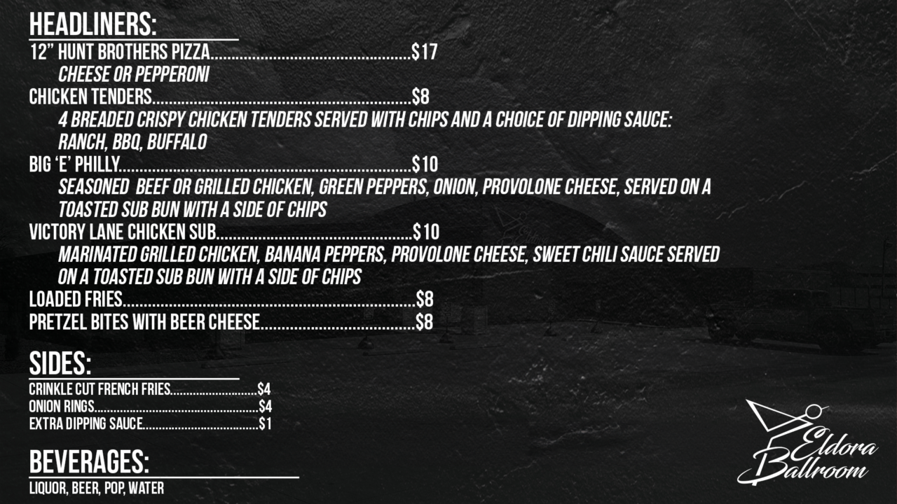 Visit the historic Eldora Ballroom on Saturday from 2pm – 7pm for delicious food and cold drinks! Whether you choose to sit around the bar or enjoy the spacious patio, you’re sure to have an excellent time! No event ticket is required for entry!